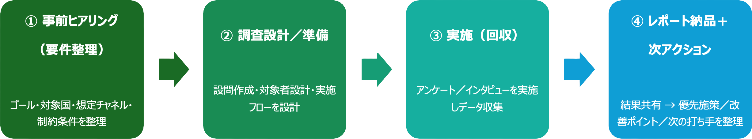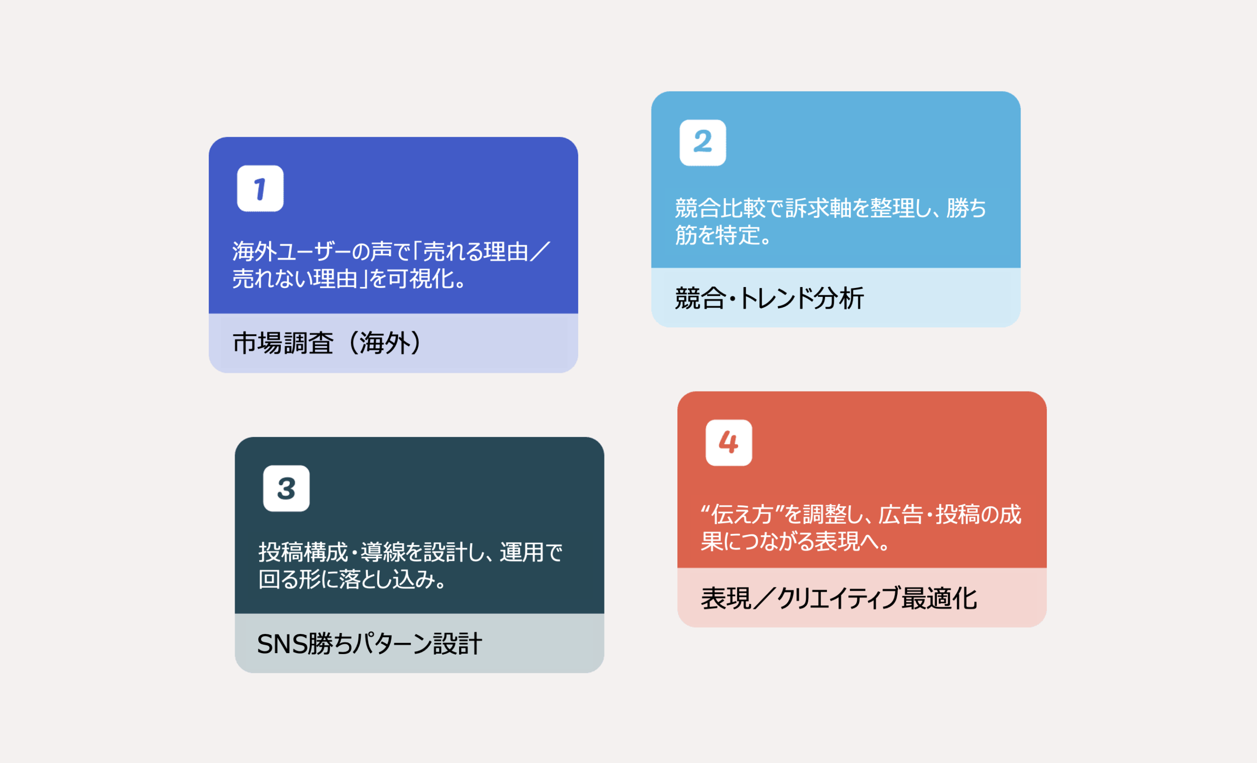 海外展開前に、ユーザーの反応・競合の見え方・勝ち筋を可視化し、訴求と導線を設計します。